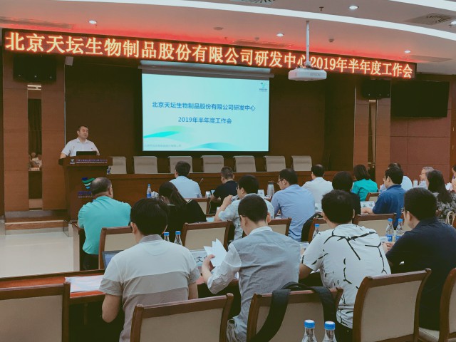 研发中心总经理余鼎作天坛生物研发中心2019年半年度工作报告。报告总结了上半年研发中心运行情况和绩效任务完成情况,并重点针对当前研发中心工作中存在问题提出了解决措施,就未来新产品研发方向进行了思考。