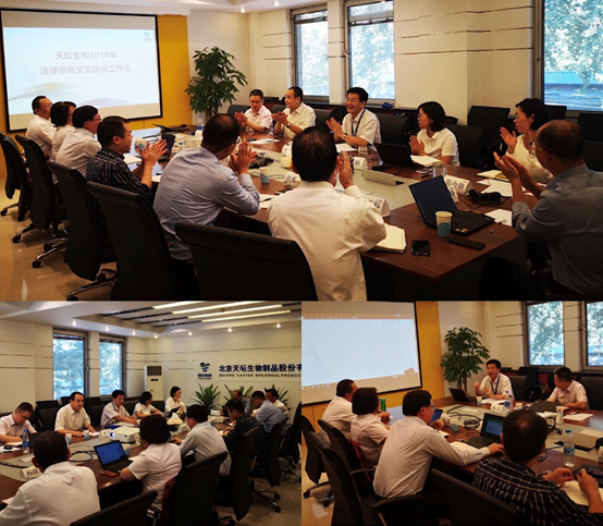 2019年9月23日,天坛生物在北京召开了2019年法律事务交流培训工作会。中国生物法务与风险管理部副主任刘利出席会议并做专题培训讲座,天坛生物副总经理、财务总监张翼到会并讲话。各血制公司、血源管理中心法务分管领导、法务部门负责人和法务岗位人员共计15人现场参会;天坛生物本部各部门(中心)负责人及骨干通过现场和线上方式参会。