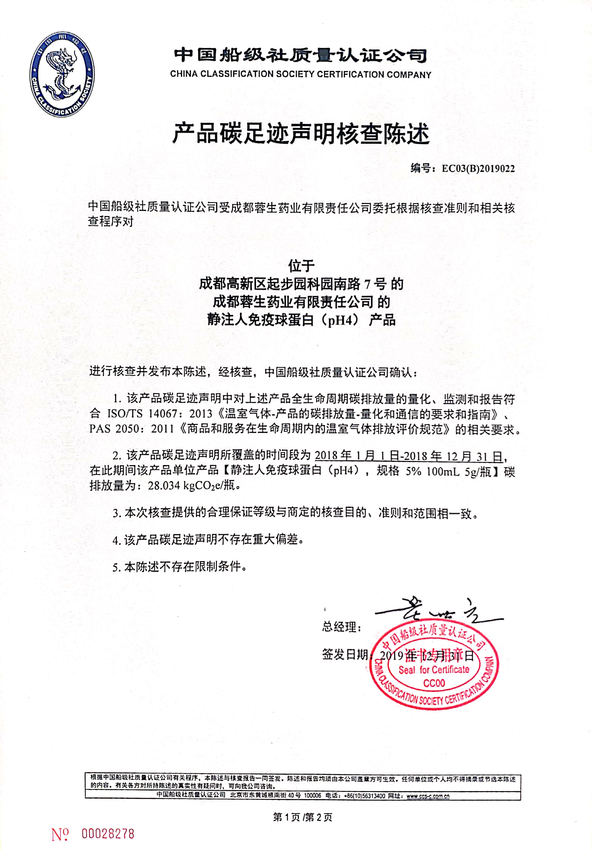 2020年4月,成都蓉生静注人免疫球蛋白(pH4)取得了中国船级社质量认证公司发放的碳足迹认证证书。