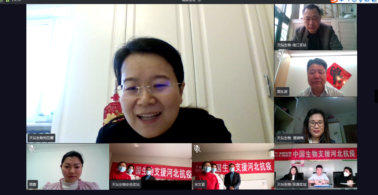 2月11日除夕当日,天坛生物召开支持河北抗疫工作新春云端慰问会。天坛生物领导、血源管理中心主要负责人、新冠肺炎康复者血浆采集小组所有人员线上参会。