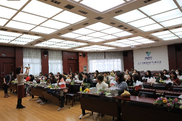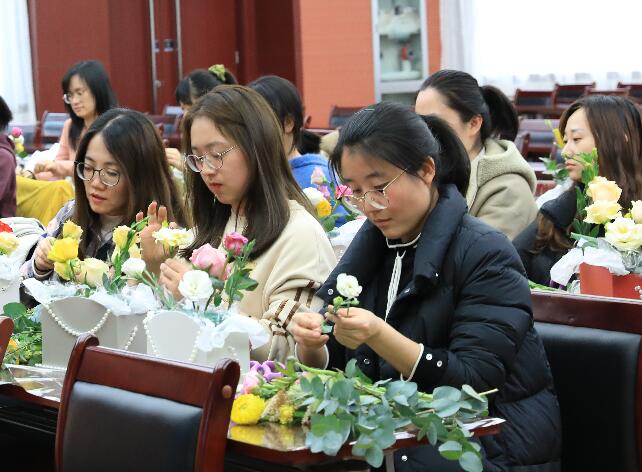 活动中,专业老师为全体女员工讲解有关花材识别、花卉寓意、色彩搭配、选材构图等方面的知识,并现场指导和演示插花技艺。在专业花艺师的指导下,大家精心选材,巧妙构思,通过不同花形、花色的搭配,捕捉和记录自己对自然以及生活之美的领悟。活动现场鲜花簇簇,芳香四溢,人面花卉恰相宜。蕙质兰心的姐姐们欢欣鼓舞、喜笑颜开,在她们精致的摆弄下,玫瑰、洋牡丹、洋桔梗、郁金香、雏菊、蓝风铃等定格出了一幅幅张扬个性的美丽图画,交织出了一首首赞美生活的悠扬旋律。