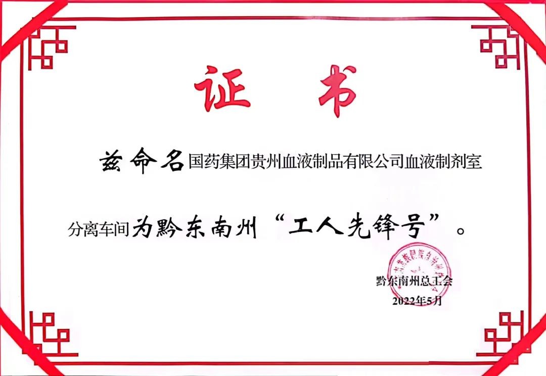 6月7日,贵州血制分离车间被黔东南州总工会授予“黔东南州工人先锋号”荣誉称号。