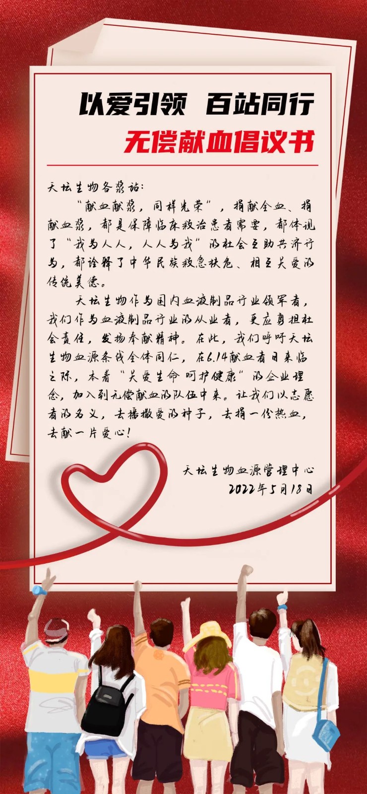 2022年6月14日,是第19个“世界献血者日”,天坛生物在全国各浆站组织了一场“以爱引领 百站同行”公益献血活动。