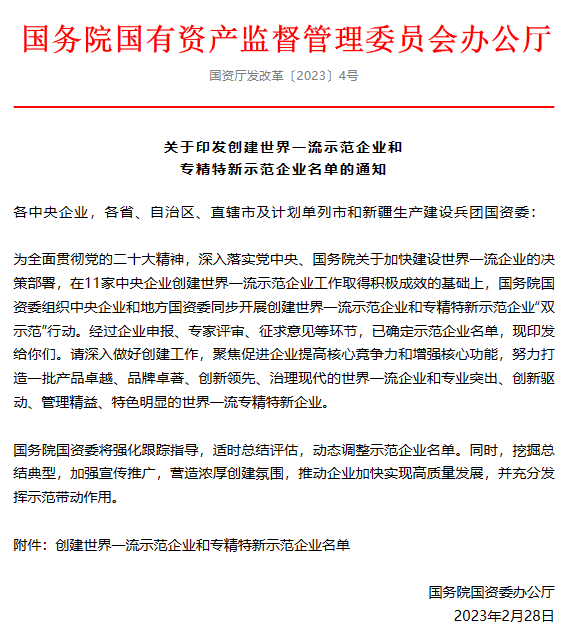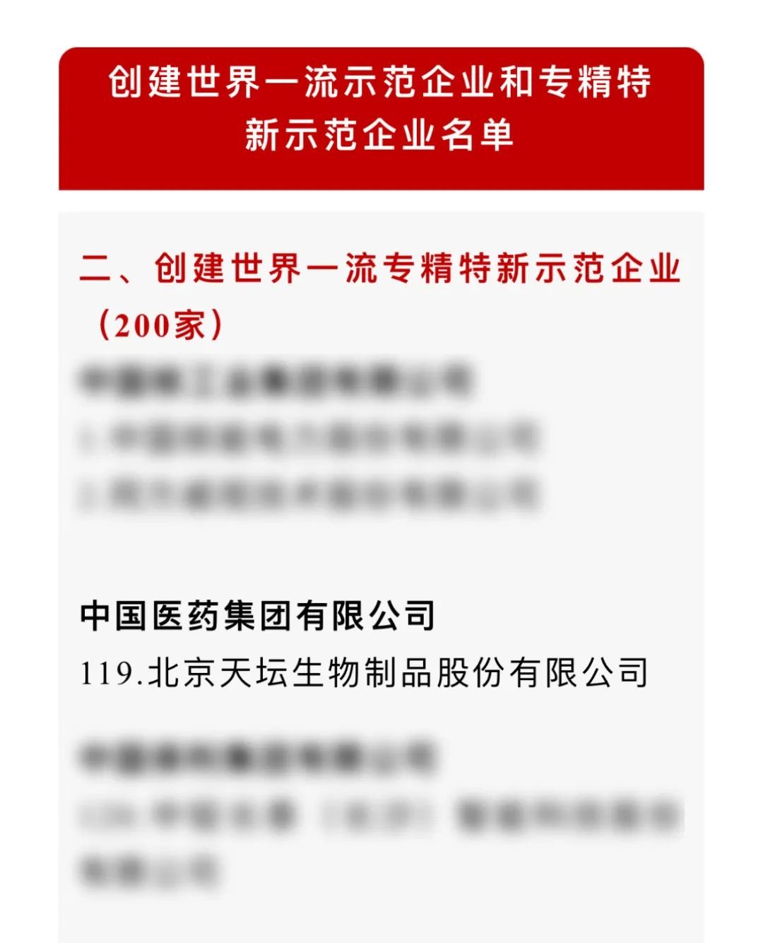 近日,国务院国资委办公厅公布最新“创建世界一流示范企业和专精特新示范企业”名单,天坛生物入选“创建世界一流专精特新示范企业”名单,成为全国首批200家世界一流专精特新示范企业之一,也是中国医药集团有限公司旗下唯一一家上榜的子公司。