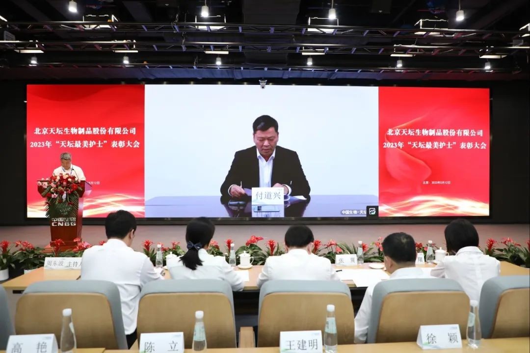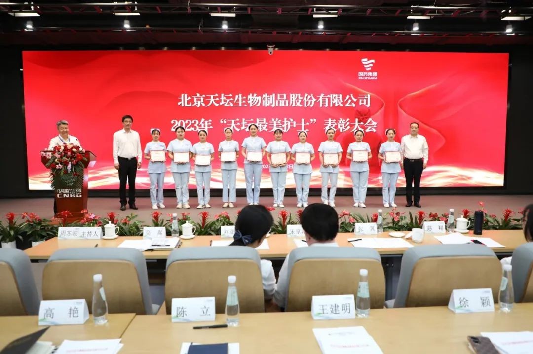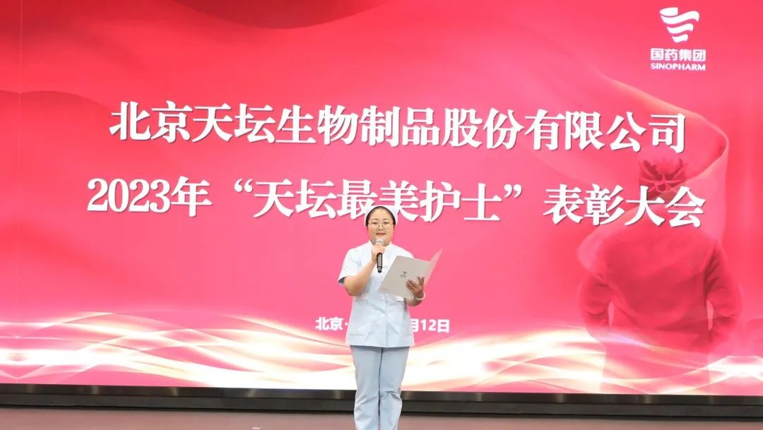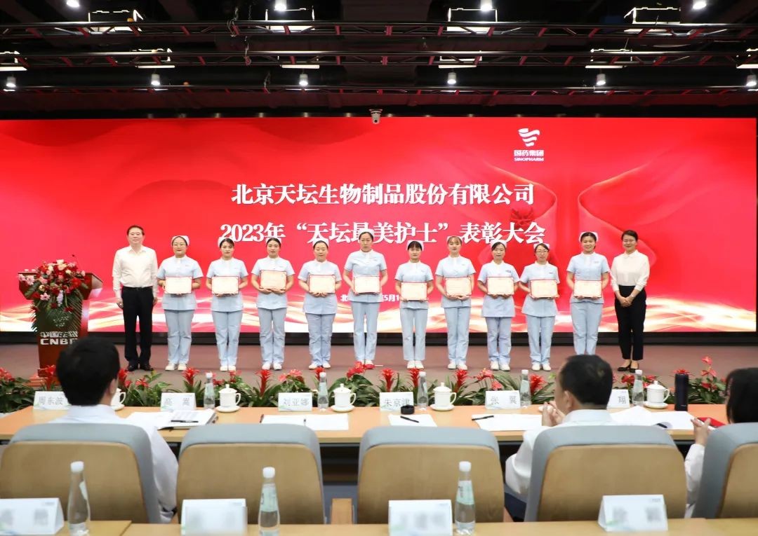 5月12日,2023年“天坛最美护士”表彰大会在北京举行。中国生物党委书记朱京津,天坛生物总经理付道兴,党委书记刘亚娜,副总经理何彦林,副总经理兼财务总监张翼,纪委书记高嵩出席会议。天坛生物常务副总经理周东波主持会议。